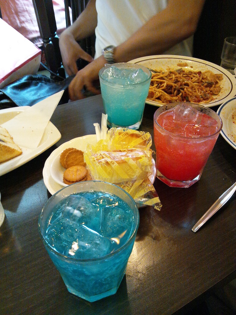 次飲み物。上の方から、妹のラムネ、マメイー、青のコーラ
